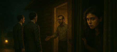 Certa madrugada, faróis cortaram a estrada. Uma van sem placas parou no portão. Desceram duas figuras — terno cinza e pastas pretas. Sem nome, só um brasão com serpente e punhal.
