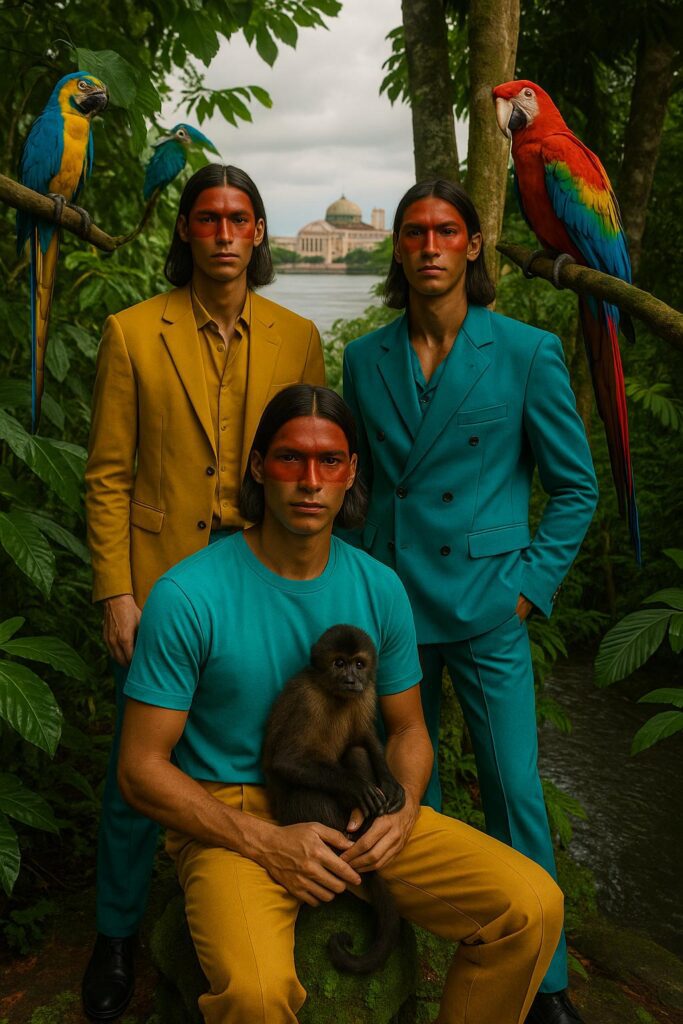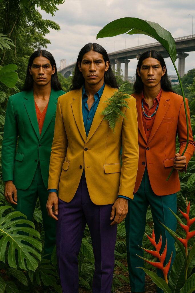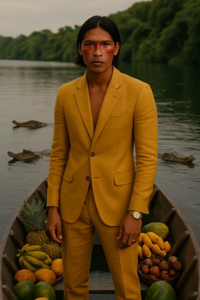 Entre folhas largas, luz dourada e silêncio denso, a alfaiataria ganha novos contornos. Assim, o ensaio se transforma em um passeio visual pela Amazônia, onde cortes precisos se entrelaçam ao entorno natural. Mais do que isso, trata-se de presença. Por esse motivo, cada imagem carrega não apenas estilo, mas também atmosfera, gesto e respiração.
