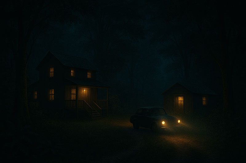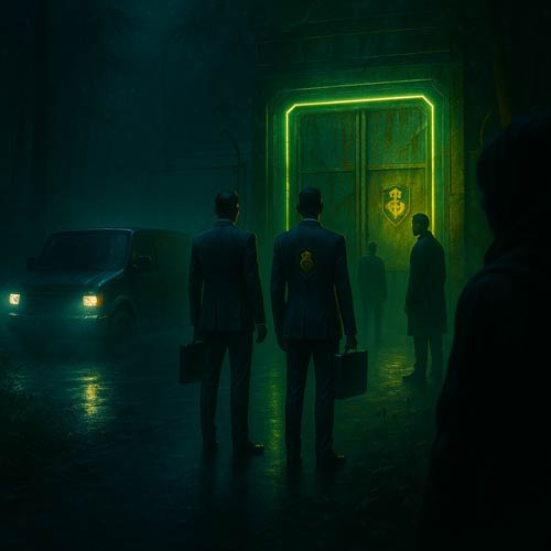 Certa madrugada, faróis cortaram a estrada. Uma van sem placas parou no portão. Desceram duas figuras — terno cinza e pastas pretas. Sem nome, só um brasão com serpente e punhal.
