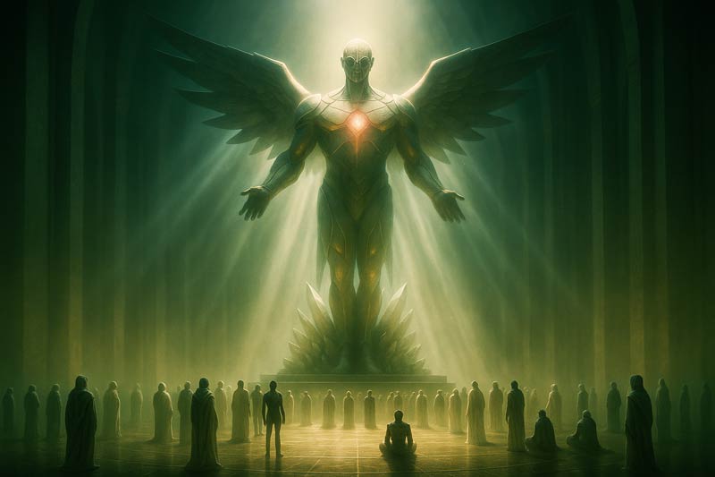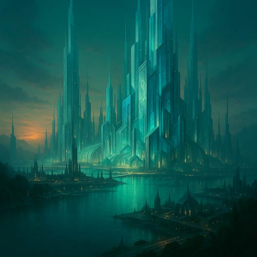 Não com a torre negra — mas com uma cidade que nunca vira. Ruas de vidro, arranha-céus em forma de cristais, luzes que mudavam de cor como auroras. Ao fundo, uma praça circular pulsava em branco ofuscante. No centro, erguia-se algo entre templo e trono. As pessoas se ajoelhavam, murmurando orações para uma figura luminosa.